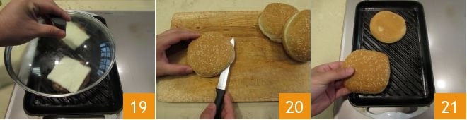 and cover with a lid, letting it cook until the cheese melts 19. If you want a warm and slightly toasted bun, cut the bread in half 20 and place both halves on the still-hot grill for a few minutes until the base becomes crispy 21.