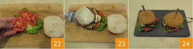 As soon as your buns are nice and warm, proceed with the assembly: place 3-4 lettuce leaves and 4 tomato slices on the base of the bun 22, then 4 eggplant slices, and finally your meat patty with the melted cheese 23. Close with the other half of the bun, and your turkey burgers are ready to be bitten into while they're still piping hot 24!