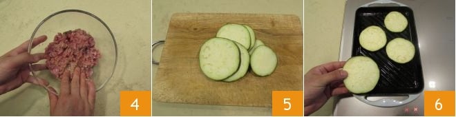 Knead all the ingredients by hand 4 and let the mixture rest in the refrigerator for 15 minutes. In the meantime, wash and trim the eggplant by removing the ends. Slice it to about 1/4 inch thick 5 and place it on a very hot and slightly greased grill 6.