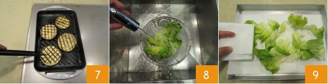 After a few minutes of grilling, flip the eggplant rounds to cook the other side 7. When done, set aside. Separate the lettuce leaves and rinse them thoroughly to remove any soil residues 8, then transfer the lettuce to a tray with paper towels and gently pat dry to avoid damaging it 9.