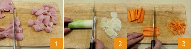 To prepare the turkey curry with crispy vegetables, start by preparing the meat: cut the turkey meat into small pieces 1, then wash all the vegetables; clean and thinly slice the leek 2, cut the carrots into small sticks 3