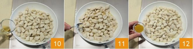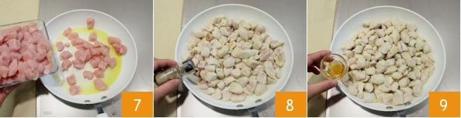and pour in the turkey 7. Brown it for a few moments, stirring; then salt and pepper 8, add the acacia honey 9,