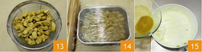 Once ready, drain the turkey, setting aside the cooking juices in a bowl 13. Then keep the turkey covered with plastic wrap 14 while you continue preparing: in the same pan where you cooked the chicken, pour the cooking juices 15