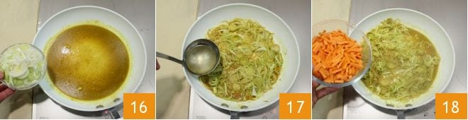pour in the leek 16, let it wilt over low heat by gradually adding Vegetable broth to aid cooking 17. When it is wilted, add the carrots 18 and cook for 5-6 minutes.