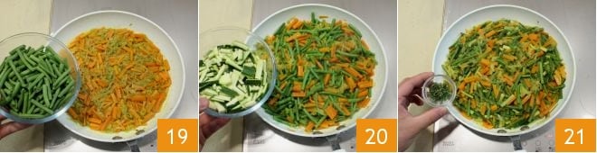 then add the green beans and cook for another 3-4 minutes 19. Add the zucchini last 20 and cook for another 2-3 minutes. Then flavor everything with chopped thyme 21.