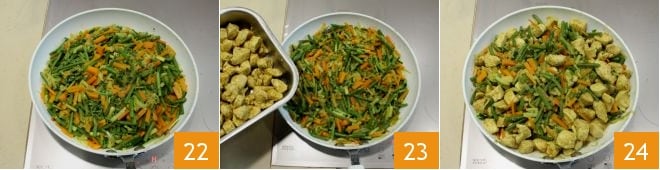 Mix and let it flavor 22, then add the turkey you had set aside 23, mix it with the vegetables and turn off the heat. Serve the turkey curry with crispy vegetables very hot 24, if you prefer accompanied by Pilaf Rice!