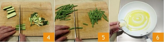 trim and cut the zucchini into small pieces, the same size as the carrots 4, then trim and do the same operation with the green beans 5. Set the vegetables aside and proceed with cooking the meat: in a pan, sauté a garlic clove over a low heat with a drizzle of oil 6, when it is well browned, you can remove it