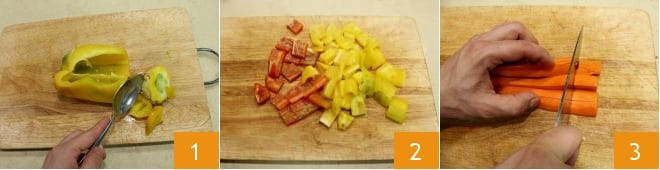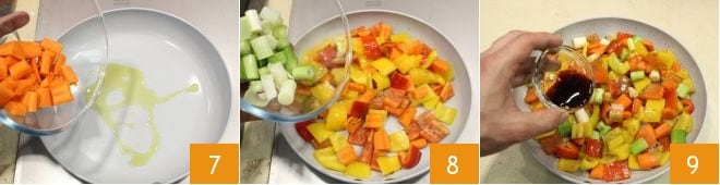 To prepare the turkey roast with soy sauce reduction and sautéed vegetables, start by washing all the vegetables under plenty of fresh running water. Clean the bell peppers by removing the two ends and the inside 1; cut them into not too thin strips and then into 3/4 inch cubes 2. Remove the skin from the carrots, cut them into strips 3,