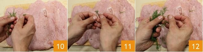 Now move on to the roast: on a cutting board, lay out the turkey breast slice; salt and pepper to your liking and spread the surface evenly with aromatic herbs: add the rosemary leaves (reserving a whole sprig) 10, thyme 11, and dill 12.