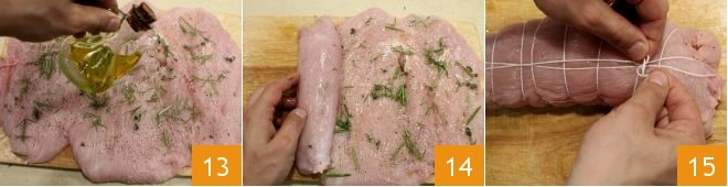 Finally, drizzle the meat with oil 13. With your hands, gently roll up the turkey 14 to form a roll; How to tie a roast to form a cage 15: this way, the roast will maintain its shape during cooking.