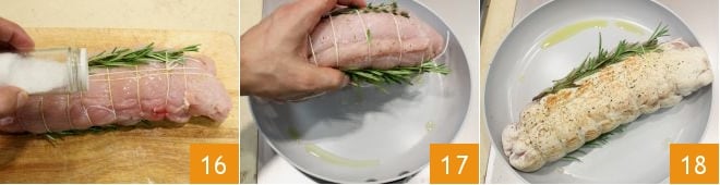 Insert the sprig of rosemary you set aside into the string in contact with the meat and adjust the seasoning with salt and pepper 16. Place a large non-stick pan with oil on the stove; lay the tied roast 17 inside, searing it on all sides: turn with spatulas or kitchen tongs for even cooking, so that it is well-browned. When the meat is well-golden, turn off the heat and set aside 18.