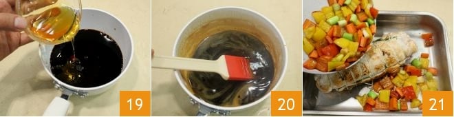At this point, prepare the soy sauce reduction: in a saucepan, pour the sauce and honey 19; heat over very low heat until the sauce has reduced by half 20. In an aluminum tray with a drizzle of oil, place the roast along with the vegetables you prepared earlier 21.