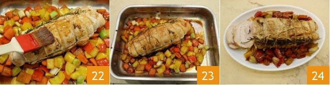 Brush it with the soy sauce and then cook in a preheated static oven at 340°F for 40-45 minutes (or 300°F for 35-40 minutes if using a convection oven), brushing every 4-5 minutes with the sauce so that the meat does not become too dry 22. To achieve even more tender meat, you can lower the oven temperature to 300°F, covering the turkey with aluminum foil, and cooking for 90 minutes. When it is well-browned 23, remove from the oven and transfer to a serving platter 24: your turkey roast with soy sauce reduction and sautéed vegetables is ready to be served.