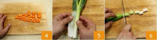 then into dice of the same size 4. Trim the scallion by removing the green part and the roots; peel it to remove the tougher outer part 5, then cut it into 3/4 inch dice 6.