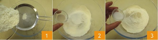 To prepare the turmeric rolls, first melt the butter over low heat, then let it cool and in the meantime start making the dough. Sift both flours into a bowl 1, add the dry yeast 2, and the sugar 3