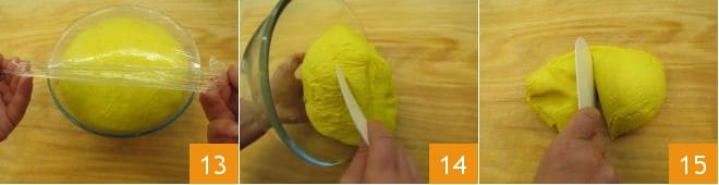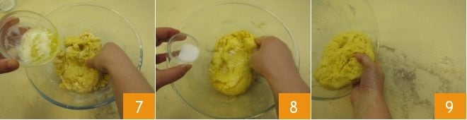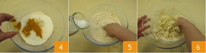 and the turmeric 4. Start kneading with your hands, slowly pouring in the milk at room temperature 5 and continue 6 until you get a homogeneous dough.