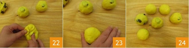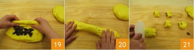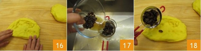 Take one and slightly flatten it with your hands 16, then drain the raisins well (if necessary, pat them with paper towels) 17 and place them in the center of your portion of dough 18.