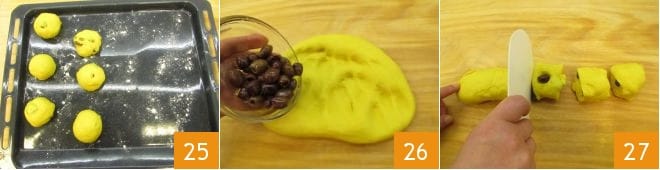place them on a slightly floured baking sheet 25 and repeat the same operation for the olive rolls. Then take the second 15 oz portion of dough set aside earlier, flatten it a bit with your hands and add the olives, drained from their brine 26. Create the usual log, divide it into 6 pieces of 3 oz each 27