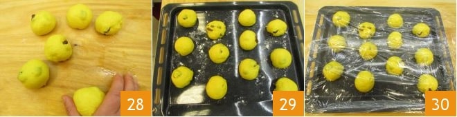 and form the balls as you did before 28. Place them on the baking sheet 29, cover with plastic wrap 30, and let them rise for another 30 minutes at room temperature. Meanwhile, preheat the oven, setting it to the static mode, and bring it to a temperature of 392°F.