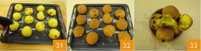 When the oven has reached the indicated temperature and the turmeric rolls have risen, moisten the surface with water; it is advisable to use a kitchen spray bottle for this operation 31. Bake your rolls for 30 minutes, on the lower shelf of the oven, until they are golden. Then take them out 32, let them cool, and serve them 33.