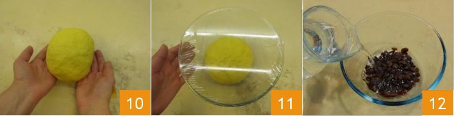Then shape the dough into a ball 10, place it in a large bowl and cover it with plastic wrap 11. Let it rise in the oven turned off with the light on for about 2 hours until the dough has doubled in size. When there are about twenty minutes left, soak the raisins in cold water to rehydrate them 12.
