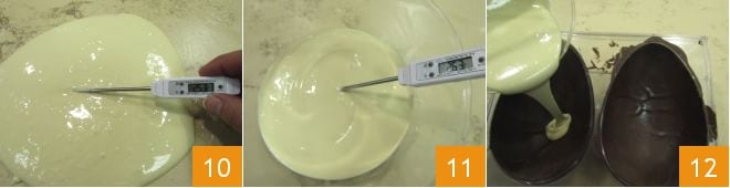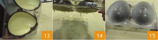 At this point, when the dark chocolate has set in the mold, pour the white chocolate (at 81/82°F) to cover the dark chocolate and rotate to distribute it evenly 13. Then after 1 minute, turn the mold upside down to let the excess chocolate drip out 14 and let it crystallize for about 20 minutes. You can then trim the edges of the egg with a scraper to eliminate chocolate peaks; let it set for about 2 hours, placing the mold on a work surface with the concave sides facing up. If the temperature is too high (above 68°F), place the mold in the refrigerator to crystallize. Once it's solidified, you can turn the mold upside down and press lightly to release the egg halves 15.
