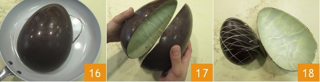 Heat a pan larger than the egg, then place it hot on the work surface and lay one half of the egg at a time with the edges facing the bottom 16; hold for a few moments to slightly warm the edges, then stick the two halves together 17. You can insert a surprise and then press the two halves together for a few minutes to let them seal perfectly. Your two-flavor Easter egg with dark and white chocolate will be ready to be gifted and enjoyed on Easter day! You can decorate it with strands of leftover white chocolate, using a piping bag with a small hole.
