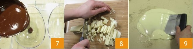 begin to work the chocolate on the marble slab, with a spatula 4 and a scraper 5, spreading it on the surface. When it reaches 82°F, transfer it to the bowl where you left the remaining 1/3 of the chocolate and mix: the chocolate should reach 88/90°F 6. If during these phases the temperature drops too low, always keep the pot of the bain-marie with hot water handy to slightly warm the chocolate. Conversely, if it's still too hot, repeat the operation of spreading on marble with a small part of the chocolate.