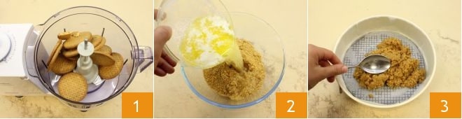 To make the two-tone cheesecake with cream and black cherries, start by melting the butter (in the microwave or a double boiler), then place the cookies in the mixer 1, finely chop them and then place them in a bowl, add the melted butter 2, mix to combine the dough and transfer it to a 9-inch diameter springform pan previously buttered and lined with parchment paper 3.