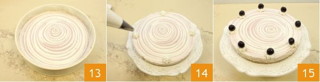 This operation will create a very scenic concentric design. Once the creams are finished 13, let the cheesecake set in the refrigerator for at least 3 hours. After the resting time, unmold the cheesecake, whip the cream with the powdered sugar, dry the black cherries well from their juice, and then decorate the cheesecake with dollops of whipped cream 14 and syrupy black cherries 15.