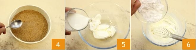 Press the mixture onto the bottom with the back of a spoon 4 to form the base and then place it to set in the refrigerator for about 1 hour. In the meantime, prepare the cream: in a bowl, mix with a whisk the cream cheese with 1 1/4 cups of cream 5 and then also add the powdered sugar 6. Divide the cream into two bowls and set them aside.