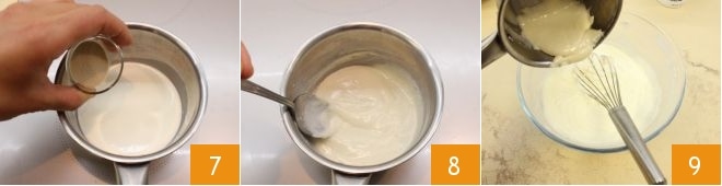 In 2 different small pots, heat 1/4 cup of cream on one side and 1/4 on the other, and dissolve the agar-agar powder, 4 grams for each pot 7, bring to a boil, then temper with a few spoons of cream and mix everything 8. This operation will prevent lumps from forming; if they do form, pass the cream through a mixer. Pour the two agar-agar mixtures into their respective bowls 9 and mix to obtain a homogeneous cream.