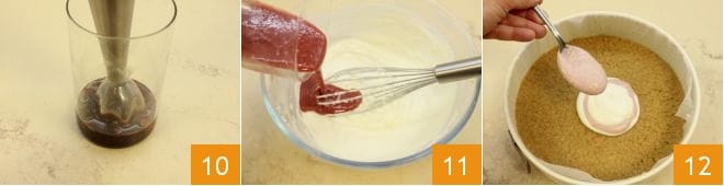 Place the black cherries and their syrup in a tall container 10 and blend them with an immersion blender to obtain a puree to add to one of the two creams 11. You will have a light cream and a pink one. Retrieve the base from the refrigerator and start forming the cheesecake: one spoon at a time, always poured in the center 12, it will gradually spread. To help with this operation, you can gently tap the pan. Continue like this until you have finished all the creams.