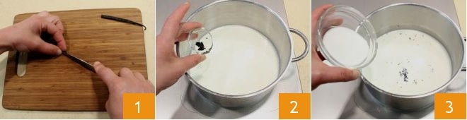To prepare the two-tone glass, start with the milk cream: slice a vanilla bean lengthwise 1, then scrape out the seeds and add them to a saucepan with the milk. Turn on medium heat and bring to a boil. Add the sugar 3