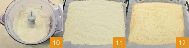 Pulse to obtain a sandy mixture 10 to spread on a baking sheet lined with parchment paper 11. Bake the crumble in a preheated static oven at 340°F for about 20 minutes (300°F for about 10 minutes if using a convection oven). Once baked, remove and let it cool completely 12.