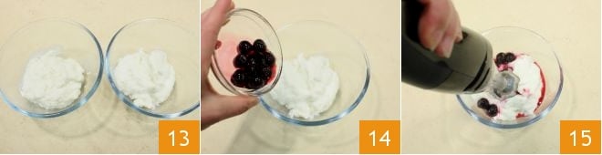 While the crumble cools, divide the now cold cream equally into two small bowls 13. Add the cherries to one 14 and blend everything 15 until smooth.