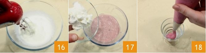 Then whip the fresh cream using an electric mixer 16, and add half to the white milk cream and half to the cherry cream 17. Stir gently from top to bottom, folding the cream into the mixtures to prevent deflation. Place the creams into two separate piping bags. Take 4 small glasses of 5 oz each and start filling them beginning with the cherry cream 18