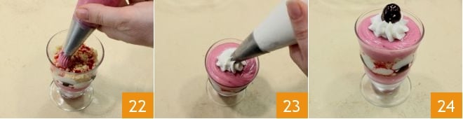 the syrup, and the cherry cream 22, going up to the edge of the glass. Finish your two-tone glasses by decorating with a dollop of white cream in the center 23 and a cherry on top 24!