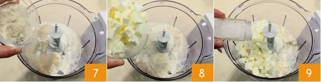 While the cream cools, focus on the almond crumble: in a mixer, place the sifted all-purpose flour and almond flour 7, the cold butter from the fridge 8, and a pinch of salt 9.
