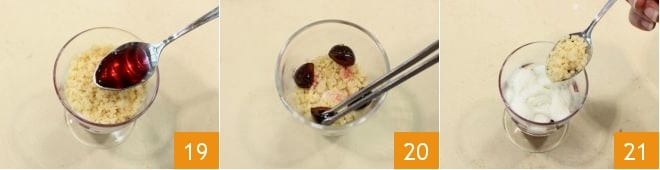 Continue with the almond crumble, and a teaspoon of cherry syrup 19; place 2 cherries cut in half on top of the crumble 20 and proceed with a layer of white milk cream. Then keep filling the glass with the almond crumble 21