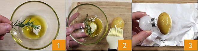 wrap the potatoes in a foil with aluminum wrap 4. Bake the foil-wrapped potatoes in a preheated static oven at 392°F 5 for about 50 minutes (or in a ventilated oven at 356°F for 40 minutes). Chop the remaining rosemary 6 and set it aside.