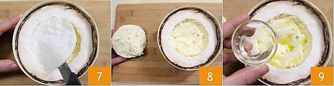 Now take the vacherin wheel, carve a circle on the top with a knife 7 and lift the crust 8. Season the vacherin with white wine 9