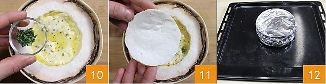 a teaspoon of oil, the chopped rosemary, and the thyme leaves 10. Close the wheel with the crust 11, wrap the vacherin with aluminum foil 12, and bake in a preheated static oven at 392°F for about 25 minutes (or in a ventilated oven at 356°F for about 20 minutes). After the required time, take your baked vacherin with herbs out of the oven and serve it piping hot and melted with the foil-baked potatoes.