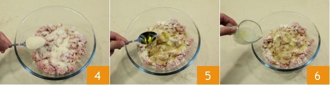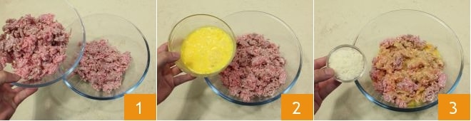 To make the veal meatballs with lemon and marjoram, place the ground veal in a bowl 1, add the beaten eggs 2, the grated Parmesan cheese 3