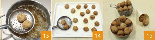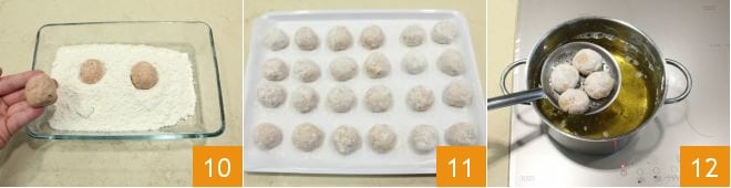 Finally, pass each meatball in flour (10-11). Cook the meatballs: heat plenty of peanut oil in a pan, when the oil has reached the ideal temperature for frying (340-355°F) immerse the meatballs in the oil 12
