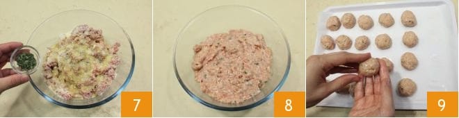 flavor the mixture with freshly chopped marjoram 7 and mix all the ingredients with a fork. When the mixture is homogeneous 8 start forming the meatballs: take a portion of the mixture the size of a walnut and roll it between your hands to shape the meatballs. With these doses you will get about 24 meatballs, as you form them, place them on a tray lined with parchment paper 9.