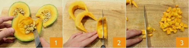 To prepare the veal scallops with vin santo, pumpkin, and mixed mushrooms, start with the vegetables: cut the pumpkin into slices and remove the seeds 1 and the outer part, then cut the flesh into smaller slices 2 and then into cubes 3.