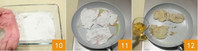 At this point, take the meat and coat it on both sides with cornstarch 10; in a pan, sauté a whole clove of garlic, then remove it and place the meat slices 11 to sear them for 1 minute on each side. Then deglaze with vin santo 12 and turn off the heat.