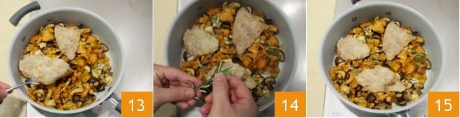 Place the scallops in the pot with the mushrooms and pumpkin 13, season with rosemary 14 and serve the veal scallops with vin santo, pumpkin, and mixed mushrooms hot 15!