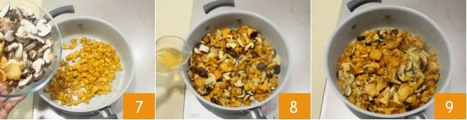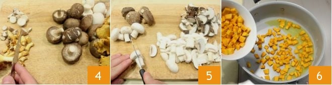 When the pumpkin is flavored, add the mushrooms 7 and cook over high heat for 12-13 minutes. Season with salt and black pepper. Towards the end of cooking, deglaze with vin santo 8, then turn off the heat and keep warm.